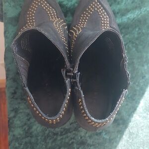 Step out in style with these Lucky Brand ankle booties, featuring a striking studded design that adds a touch of edge to your look. Crafted in a sleek black color, these boots offer a comfortable fit with a convenient side zipper closure. Perfect for any occasion, they combine fashion and function effortlessly.