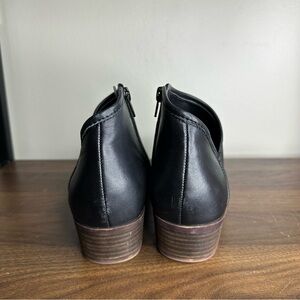Sleek black leather ankle boots. Stacked heel. Side zipper closure.