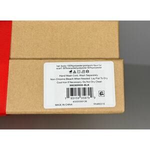 Material: Hat 100% polyester; pom pom faux fur with 50% recycled polyester; scarf 50% recycled polyester