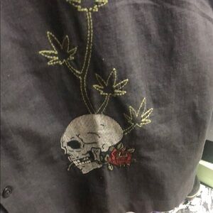 Stylish black button-down shirt. Features skull and crown design. Perfect for casual outings.