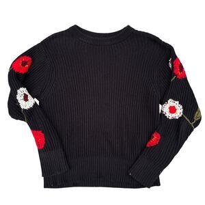 Lucky Brand black cotton sweater in size XS. Features embroidered red and white florals along the sleeves for a boho-inspired touch. Rib knit crewneck design with long sleeves and cropped length. Made from breathable cotton, this sweater is versatile for layering with jeans, skirts, or dresses across seasons.