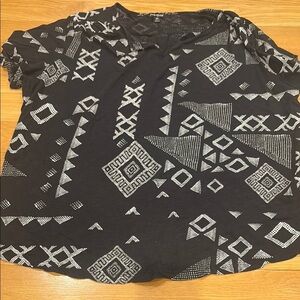 This stylish blouse from Lucky Brand features a striking black base with a bold geometric pattern, offering a modern and artistic flair. The boxy silhouette and graphic design make it a standout piece for any casual or chic occasion.