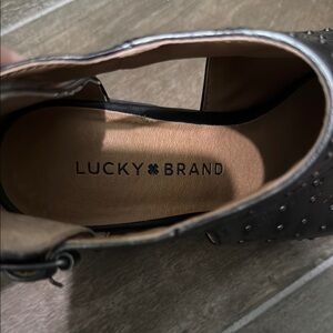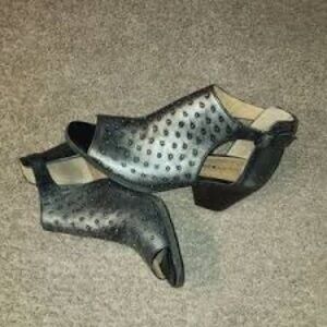 These black heeled booties from Lucky Brand feature a stylish cut-out design, offering a modern twist to classic footwear. The perforated texture adds a unique touch, while the small heel provides a comfortable lift. Perfect for both casual outings and dressy events, these booties are crafted from a leather-like material for a chic and breathable fit.