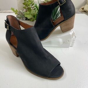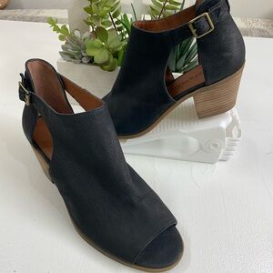 Lucky Brand Black Heeled Boots with Peep-Toe Design in new condition