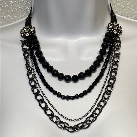 This stunning necklace from Lucky Brand features a captivating blend of black beads and a silver-toned chain, creating a chic layered look. The graduated strands offer a sophisticated cascade, making it a versatile accessory for any occasion. Its elegant design effortlessly enhances both casual and formal outfits. Ribbon allows for customizable length. Excellent condition.
