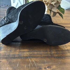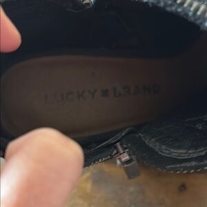 These chic black suede ankle booties from Lucky Brand feature a stylish open-toe design and a V-shaped opening at the top. The soft, velvety texture and low ankle height make them a versatile addition to any wardrobe. Perfect for adding a touch of elegance to your outfit.