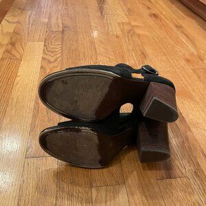 Lucky Brand black suede peep toe booties in size 8. Color removed from bottom of shoe and a little on sides but can be colored in - as pictured. Heel is in great condition. Approx heel height 3". Hardly worn.