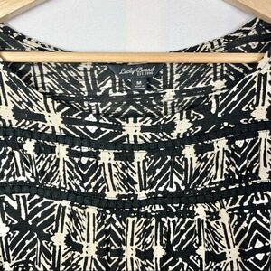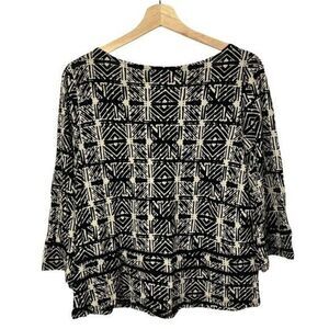 Lucky Brand Black & Tan Cross Hatch Geometric Printed 3/4 Sleeve Blouse M