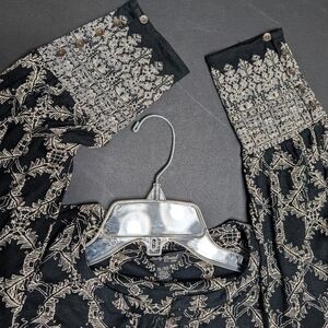 Stylish blouse with intricate black and tan pattern. Perfect for any occasion.