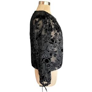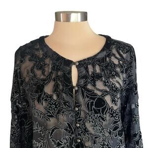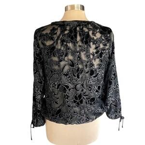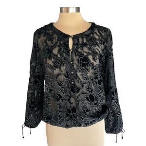 Lucky Brand Black Velvet Burnout Top MED Whimsigoth Vamp Witchy Dark Romance. Sheer mesh with velvet pattern with metallic shine. Ornate buttons. Cuffs have ties. Hem has elastic that creates a blouson effect. Henley style button front. Would be beautiful for holiday wear.