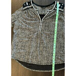 This Lucky Brand blouse features intricate embroidery and a black and white geometric print. The lightweight fabric blend ensures comfort and style for casual or semi-formal settings. Delicate detailing at the shoulders and neckline adds a touch of elegance.