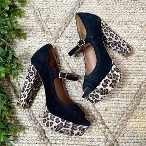 Stylish black heels with leopard print accents. Features a chunky heel and ankle strap. Perfect for a bold look.