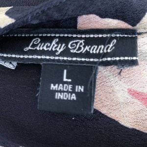 This stylish dress from Lucky Brand showcases a black base adorned with a pink floral pattern, perfect for casual or work settings. The long bishop sleeves and mandarin collar add a touch of elegance, while the lightweight fabric ensures comfort and ease of movement. Ideal for versatile wear, this dress combines sophistication with a relaxed vibe.