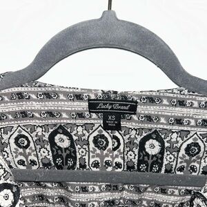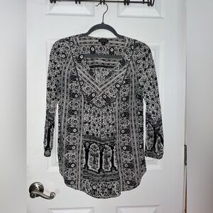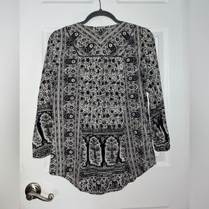 Stylish black and white blouse. Intricate pattern design. Perfect for casual wear.