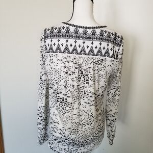 Lucky Brand Black and White Boho Embroidered Floral Shirt, great pre worn condition, size small, v neck, high low hem, cinched long sleeves