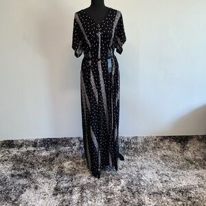 Chic maxi dress with a stylish pattern. Features a flattering silhouette. Ideal for any occasion.