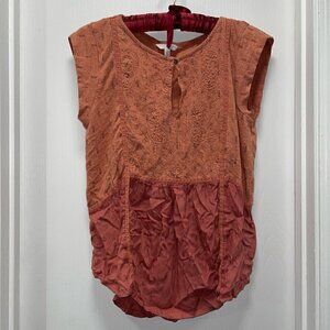 Lucky Brand Blouse Boho Peasant Top Cap Short Sleeve Tunic Modal Linen Aztec