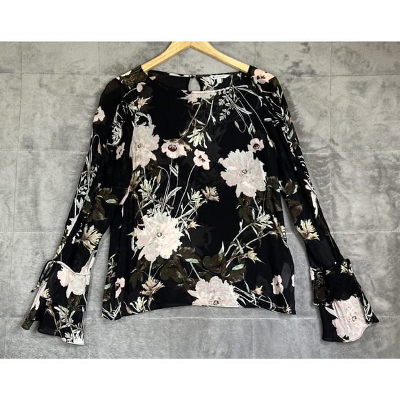 Lucky Brand Blouse Medium Dark Floral Black Pink Bell Sleeve Ruffle Whimsigoth