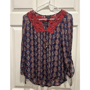 Lucky Brand Blouse Womens Medium Blue Crochet Neck Detail Aztec Floral Top