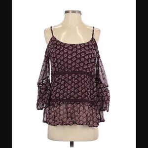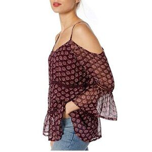 Off-the-shoulder maroon peasant blouse in small-scale pattern by Lucky Brand. Size XS, new with tags!