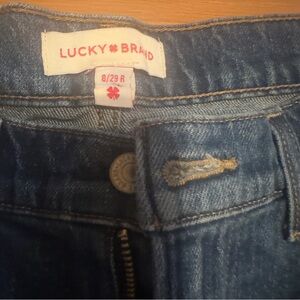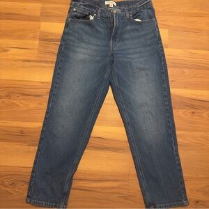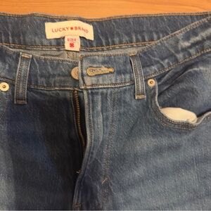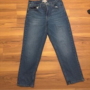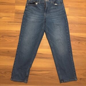 Light blue denim jeans with a relaxed fit. Features classic stitching and button closure.