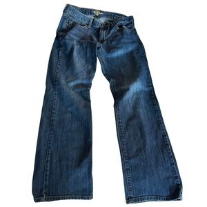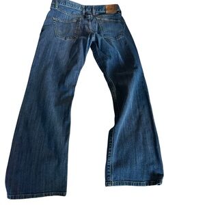 Blue denim jeans featuring yellow stitching. Comfortable and stylish for everyday wear. 34x32