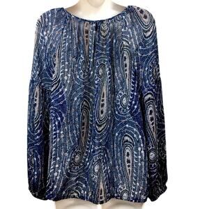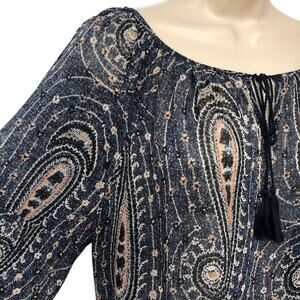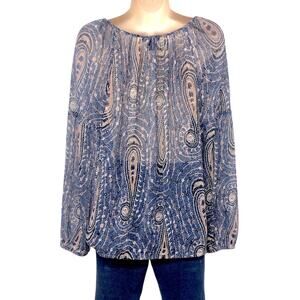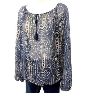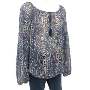 Lucky Brand Blue Pink Paisley Long Sleeve Popover Top Elastic Waist and Sleeves Tassel Ties, Scoop Neck