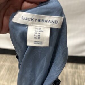 This casual sundress by Lucky Brand showcases a sleeveless design with a chic mock neck, perfect for warm weather outings. The soothing blue color palette and midi length create a relaxed yet stylish look, ideal for a day out or a casual gathering. Crafted with a flowing silhouette, this dress offers both comfort and elegance.