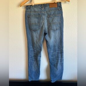 These Lucky Brand jeans feature a timeless straight-leg silhouette in a medium blue wash, offering a comfortable and versatile style for everyday wear. The denim showcases a subtle lived-in look with natural fading, ensuring a casual yet polished appearance.