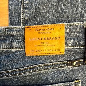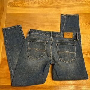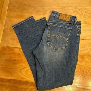 Classic denim blue jeans with a slightly worn, vintage look, made of good quality denim fabric.