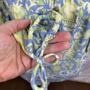 Lucky Brand Blue & Yellow Floral Elastic Waist, 3/4 Sleeve Top, Brass Buttons.  Good over all condition with a small flawed area in front of Shirt as shown in last photo.  Very cute design.