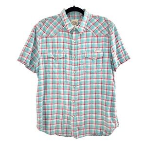 This casual button-down shirt with pearl buttons from Lucky Brand features a vibrant blue and red plaid pattern, perfect for a relaxed and stylish look. Ideal for warm weather, its lightweight fabric ensures comfort throughout the day.