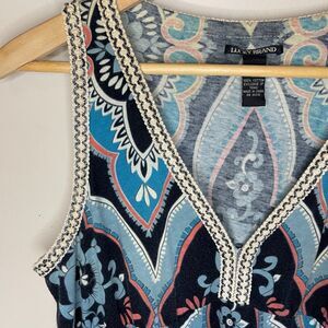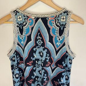 Elegant midi dress with intricate patterns. Sleeveless design. Perfect for casual outings.
