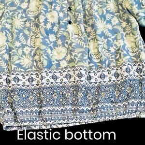 Chic blouse with floral design. Features blue and yellow tones. Lightweight fabric. Perfect for casual outings. Make me an offer!