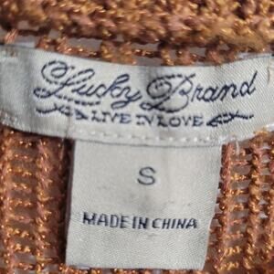 Lucky Brand Boho Crochet Sweater Brown Tie Neck Open Knit Semi Sheer Top Small