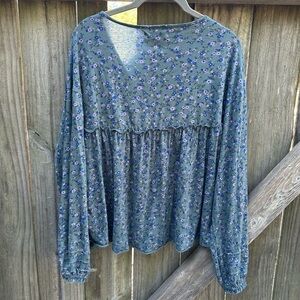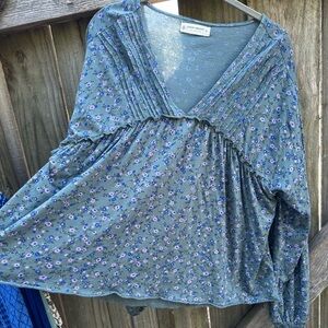 Lucky Brand Boho Floral Modal Blend VNeck Pleated Bubble Sleeve Oversized Blouse