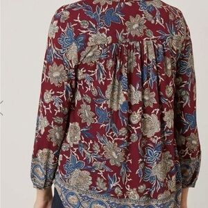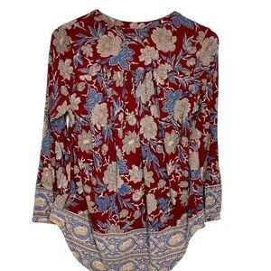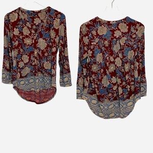 Lucky Brand dark burgundy floral pullover top with blue trim around the bottom of the high/low hem, as well as the cuffs. Three button closure at the front. V-neck. Loose and flowy for a comfortable fit. Excellent pre-owned condition. Size S.