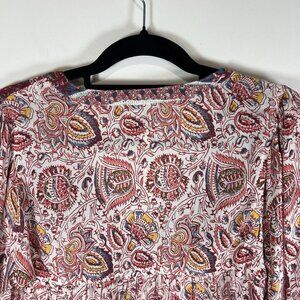 Lucky Brand Boho Peasant Top in Size Small is a red viscose blouse with a paisley pattern and tasseled accents. The top features a V-neckline and 3/4 sleeves, making it perfect for all seasons and occasions, including travel, casual wear, and workwear. The blouse is machine washable and has a relaxed fit, making it breathable and comfortable to wear. The top is part of the Bohemian, casual, festival, hippie, resort, and vacation theme collections.