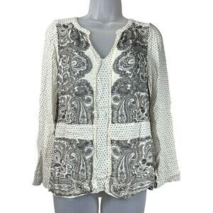 Lucky Brand Boho Peasant Top Small Black White Paisley Print Long Sleeve