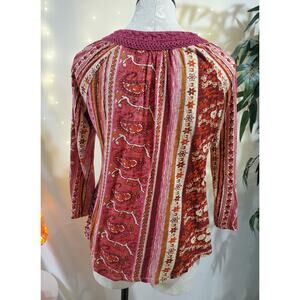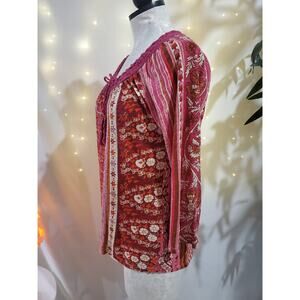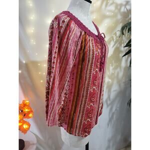Lucky Brand Boho Stripe Crochet Tie Neck 3/4 Sleeve Peasant Top Womens Size S