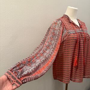Lucky Brand Boho Tassel Tie Peasant Blouse Coral Orange Geometric Print Small