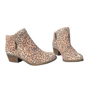 Distressed Suede leather ankle booties in a suede leather trendy leopard print. Like new condition with double zippers (one on each side of boot) and no signs of wear.