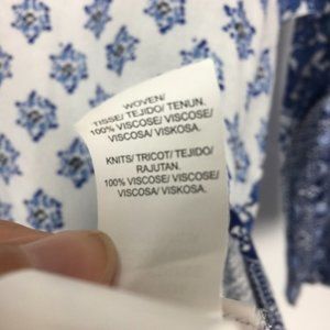Porcelain medallion Print With Paisley Border Prints. Round Neckline. Pullover Design. Three Quarter Sleeves. Droptail Hem. 100% Viscose.