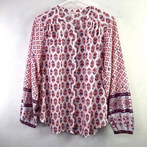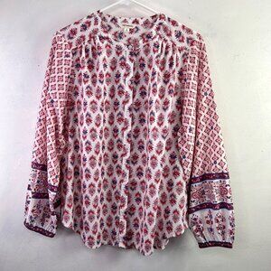Lucky Brand border print top blouse in shades of red, blue and white. Floral abstract print, loose fit, button front, elastic cuffs, good condition. Style 135645 from 2024. Size S.