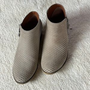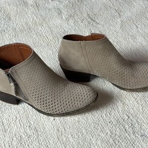 An asymmetrical topline adds an intriguing counterpoint to the orderly grid of perforations on a suede bootie lifted by a low, stacked heel.