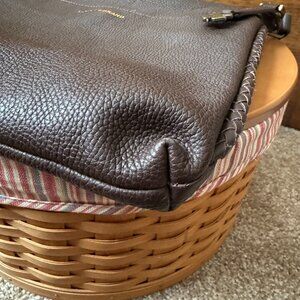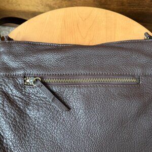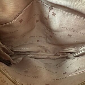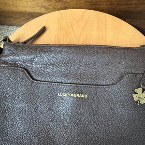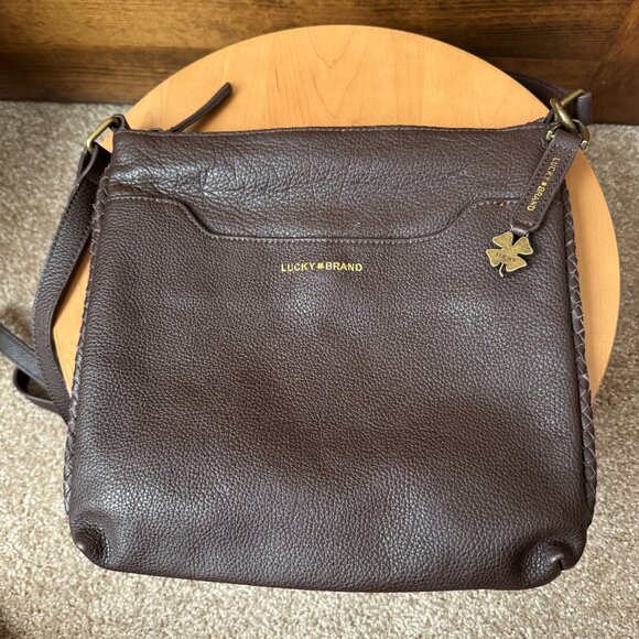 Lucky Brand; Crossbody Bag; Brown; Body: 100% Leather; Lining 100% Polyester Front: Slip Pocket w/Hidden Magnetic Snap Close; Gold "Lucky Brand" Stencil; Back: Zip Close Pocket w/Brown Leather Pull; Top: Zipper Close; Braided Leather Trim Around Outer Edge; Interior Golden Logo Fabric Lining; Interior Front Wall: 2 Slip Pockets; Interior Back Wall: Zipper Close Pocket; Brown Leather Hang Tag w/Brass Four Leaf Clover Embossed w/Lucky; Crossbody Strap 22" Drop w/Additional 6 1" Drops; 11"L x 10"H