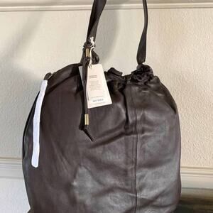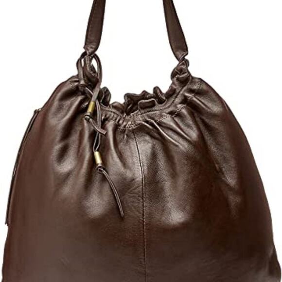 Elegant brown leather hobo bag. Features a drawstring closure. Comfortable shoulder strap.