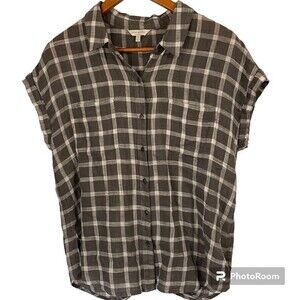 Lucky Brand Brown Plaid Button Down Boyfriend Top Blouse With Tie Back Size M