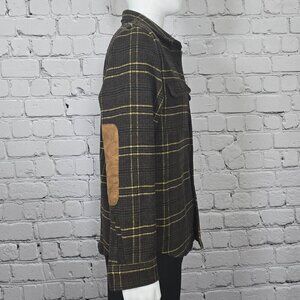 Lucky Brand's Men's Medium Brown Plaid Workshirt is a heavy-duty, wool-blend shirt featuring elbow patches. Crafted with a 50% polyester, 40% wool mix, it ensures durability and warmth. Made in China. Measurements available in images.