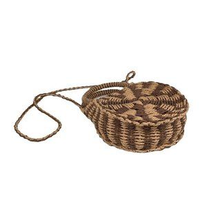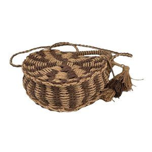 Stylish round crossbody bag. Woven design with tassel detail. Perfect for casual outings.